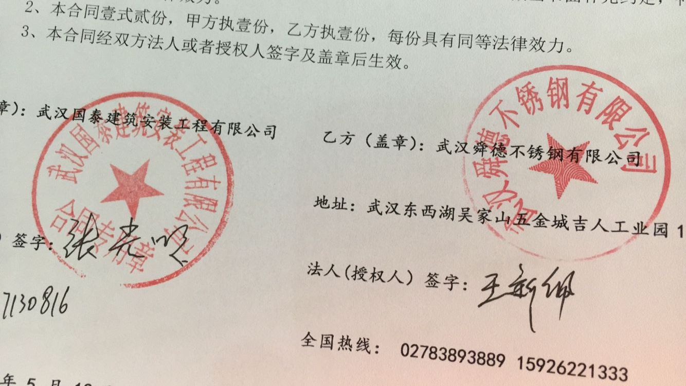武漢國泰建築安裝工程有限公司和我公司合作不鏽鋼茄子果酱APP官网,合同已貼出。